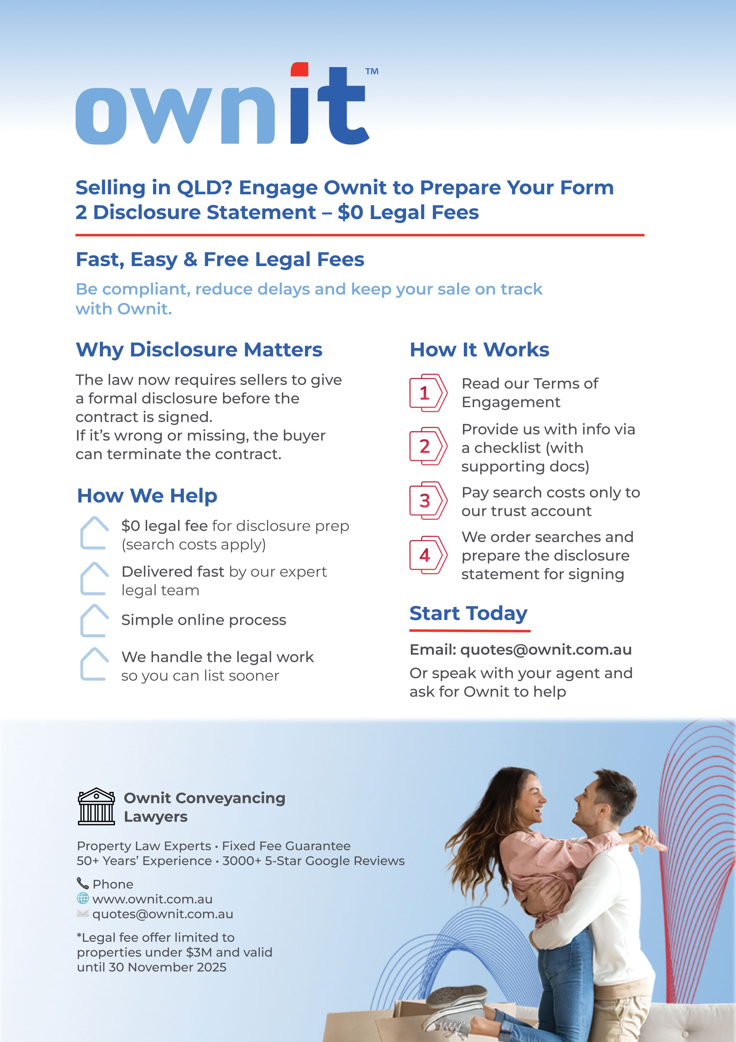At Ownit Conveyancing Lawyers, we’re across the legislative changes and make compliance easy and affordable – with $0 legal fees for preparation of this important document.